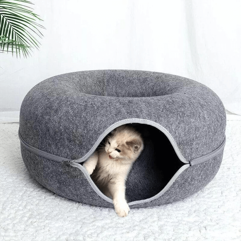 Our beds offer a safe, secure retreat for your kitty. The comfy donut bed on top, paired with a spacious tunnel, provides the perfect spot for your pet to relax, hide, and sleep soundly